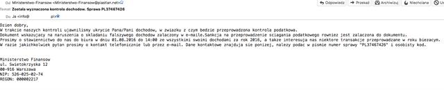 Oto przykładowa treść fałszywej wiadomości dotyczącej „wyznaczonej kontroli dochodów":